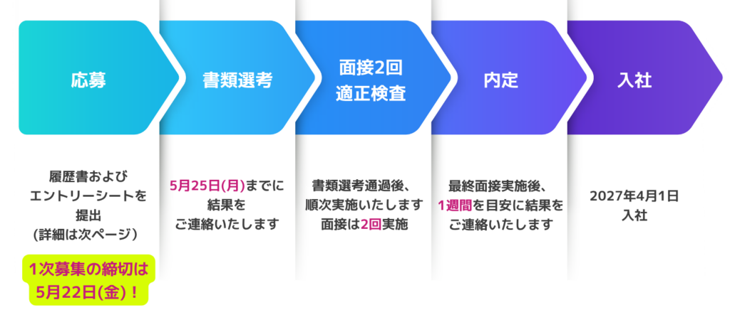 弊社では2027年卒業予定の方を対象とした新卒採用を実施しております。 現在は1次募集の受付期間となっており、書類提出の締切は5月22日(金)です。
